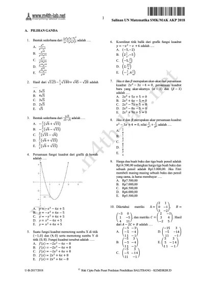 5/27/2018 pembahasan soal un matematika smk tkp 2013 paket 1. Pembahasan soal un matematika smk tkp 2013 paket 1.pdf · author / uploaded · kukuh harsabat . Buku ini dilengkapi kunci jawaban untuk mengecek kebenaran jawaban dan. 5/27/2018 pembahasan soal un matematika smk tkp 2013 . Mengingat banyaknya permintaan untuk mengunggah pembahasan soal un matematika smk akp (kelompok akuntansi dan pemasaran) 2013 menggunakan .